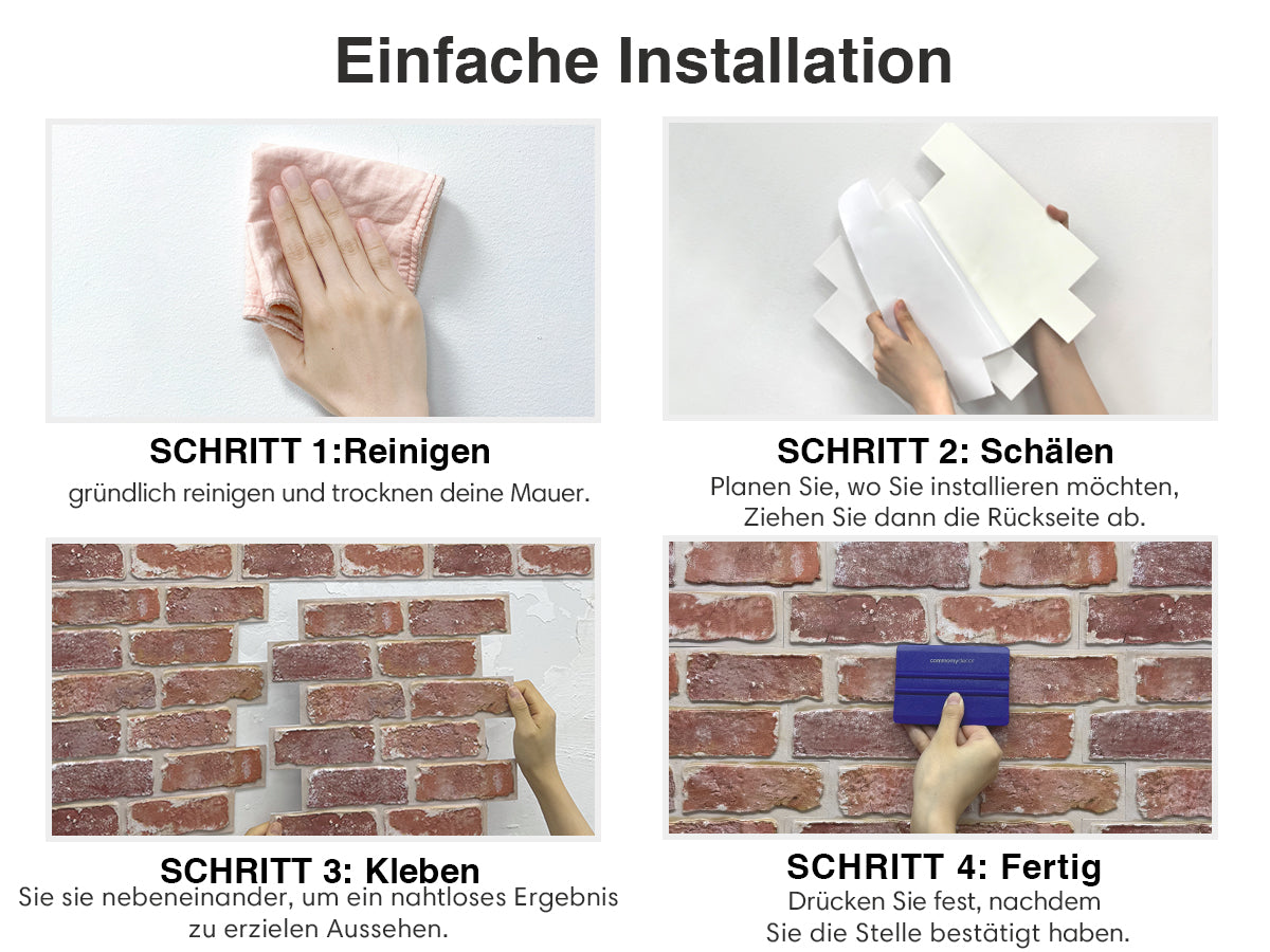 Wir möchten Ihnen die Installation unserer Commomy Wandaufkleber, Wandpaneele und Dekorfolien so einfach wie möglich machen.