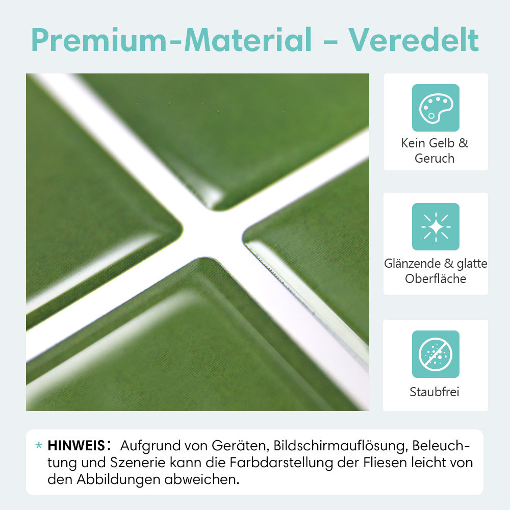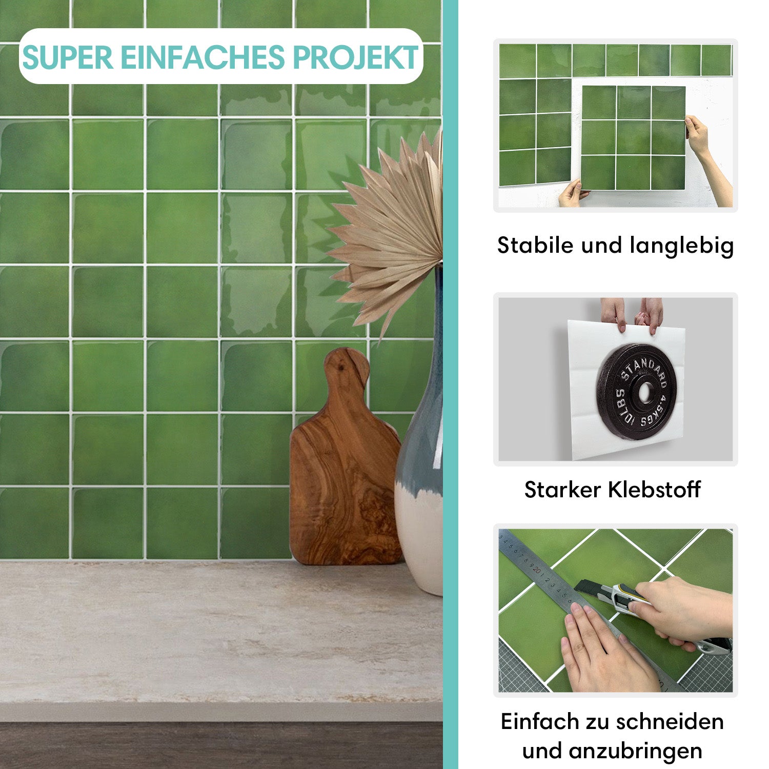 Selbstklebende Wandfliesen aus grünem Quadrat – Dickere Ausführung bieten eine einfache, schnelle und saubere Alternative zu herkömmlichen Fliesenarbeiten. Die hochwertigen, selbstklebenden Fliesen sind speziell für Küchen- und Badezimmerrückwände konzipiert und überzeugen durch eine robuste Dicke, die eine stabile Optik und eine langlebige Haftung gewährleistet.