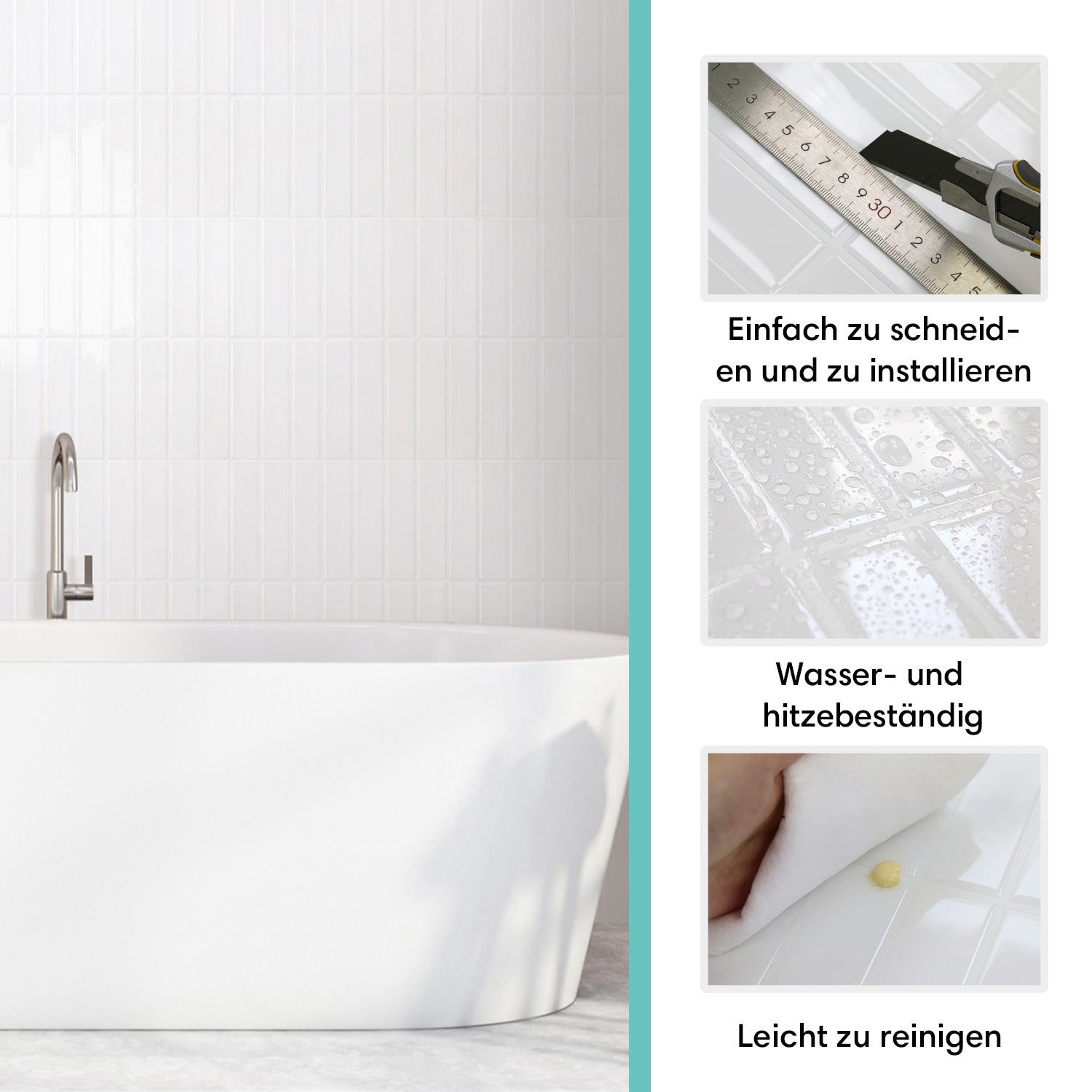 Einfache Installation: Einfach abziehen, ineinander stecken und aufkleben – ganz ohne Fugen oder Schmutz!