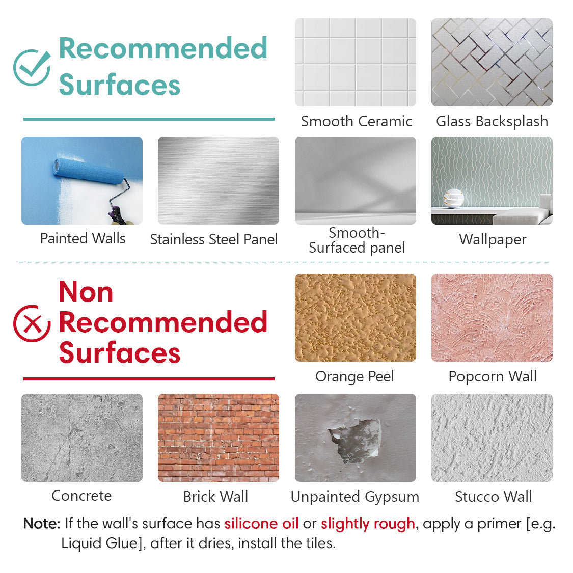 A: Unsere Fliesen haften am besten auf glatten, sauberen und trockenen Oberflächen, einschließlich leicht strukturierter Wände. Eine vollständige Liste der geeigneten Untergründe finden Sie in unserer Installationsanleitung. Hinweis: Bei schwierigen Oberflächen oder starken Texturen kann das Auftragen einer dünnen Schicht Sprühkleber (z. B. 3M Super 77) helfen, eine dauerhafte und sichere Verbindung zu gewährleisten.